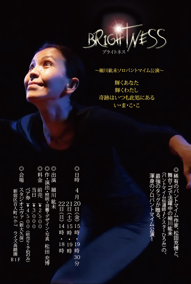 バブルの終わり頃、堅気の職に就いたと思ったら東京マイム研究所にふらふらと入り卒業。その後も、仕事をしながらなんだかんだパントマイムを続け、気がつくともういい歳だ。ただ面白いだけではなくメッセージ性がある作品が好き。